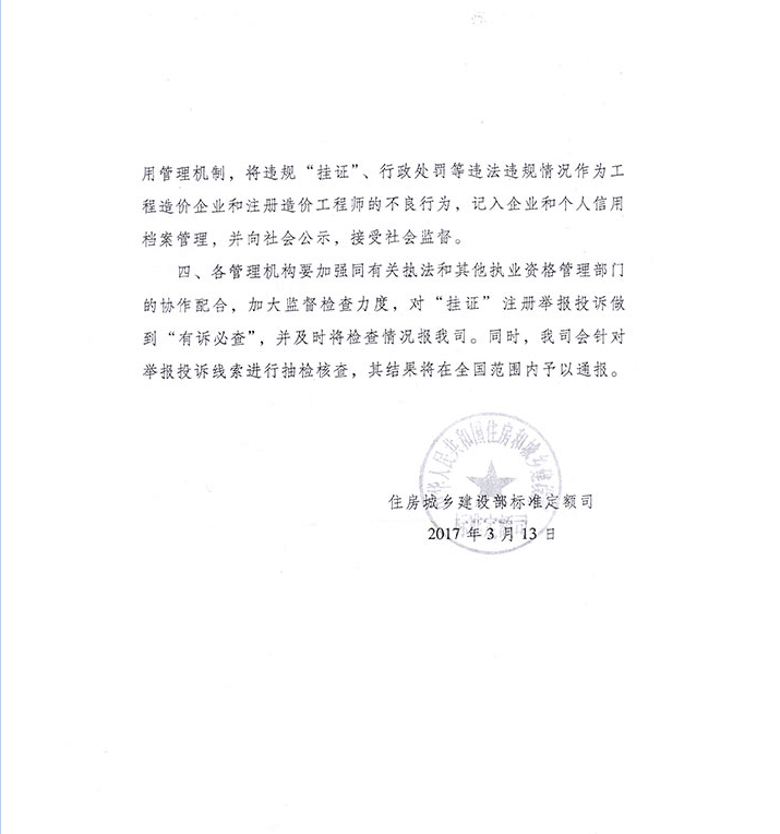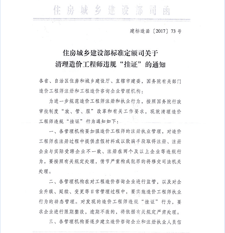 住房城鄉(xiāng)建設(shè)部標(biāo)準(zhǔn)定額司關(guān)于清理造價工程師違規(guī)“掛證”的通知