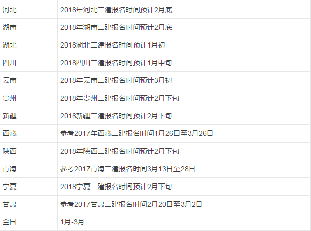 重慶市的報名時間已公布,其它省份的也不遠了,下表為各省份2018二建報名時間預測(紅色表示已更新),小編會在各個省份報名時間出來的時候及時告知大家,請大家繼續(xù)關注!