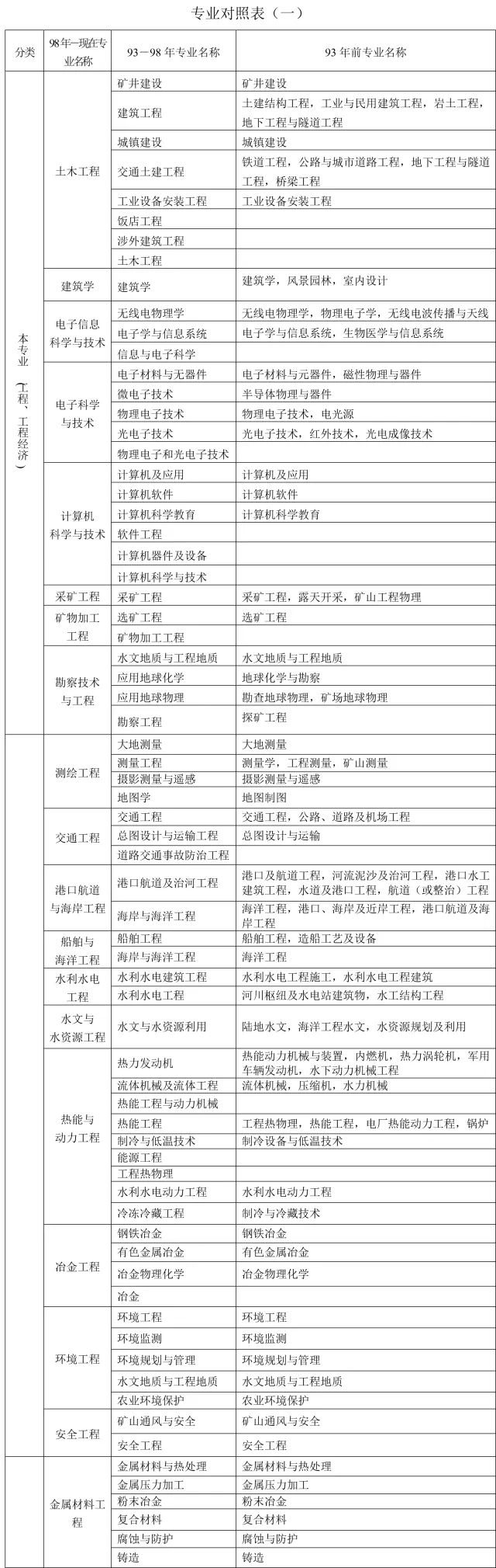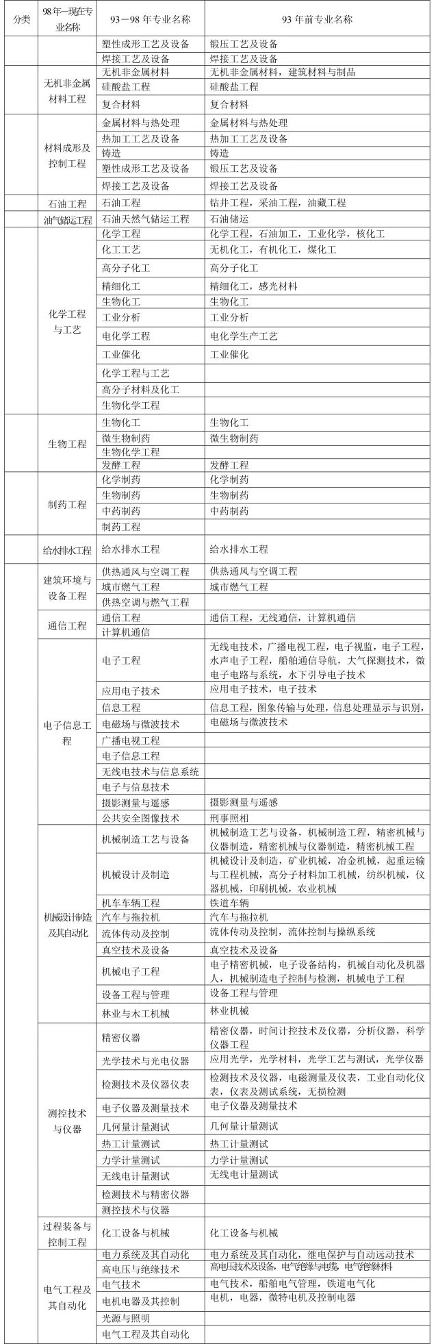 1、本表按教育部現(xiàn)行《普通高等學(xué)校本科專業(yè)目錄新舊專業(yè)對照表》編制,共涉及“土建類、測繪類、水利類、交通運輸類、能源動力類、地礦類、材料類、電氣信息類、機械類、管理科學(xué)與工程類、生物工程類、化工與制藥類、工程力學(xué)類”等18類45個專業(yè),其中本專業(yè)36個,相近專業(yè)9個。