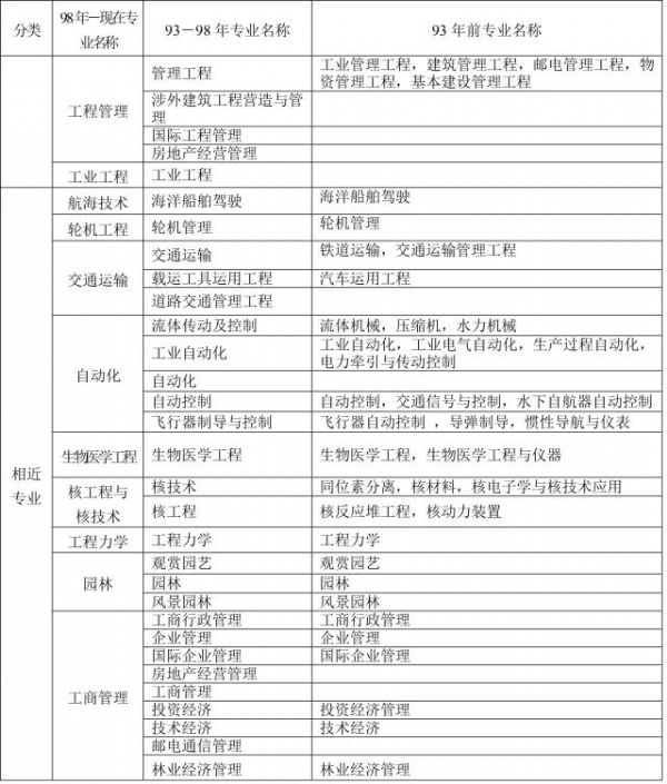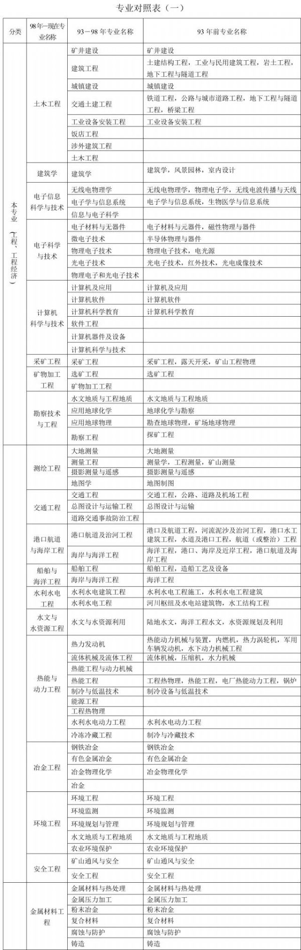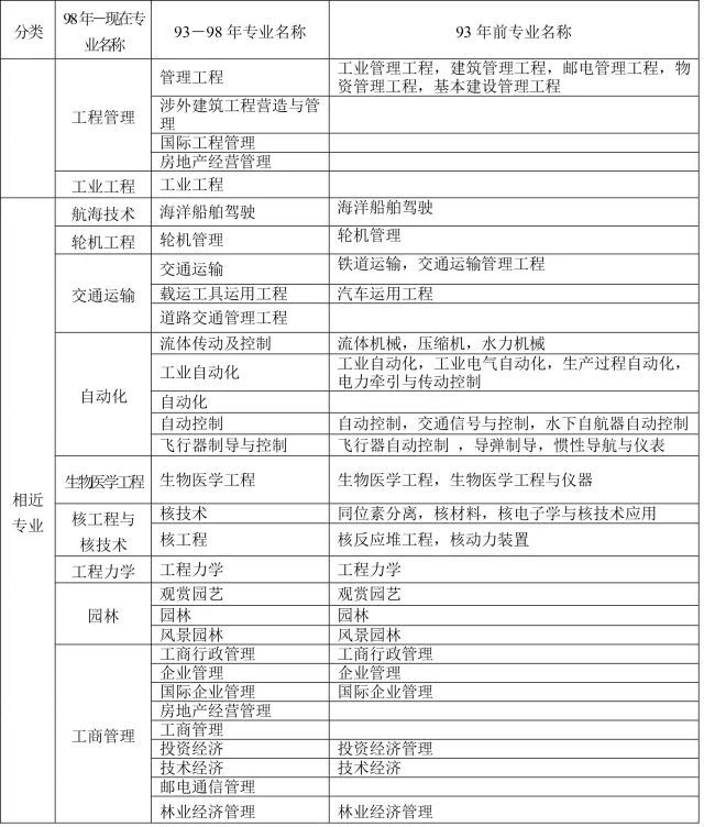 3、 為便于考核認定條件中有關(guān)專業(yè)學(xué)歷的確認,對“本專業(yè)”、“相近專業(yè)”和“其他專業(yè)”進行了劃分,供申報和審核考核認定條件時參考。其他專業(yè)的具體范圍由建設(shè)部、人事部確認。