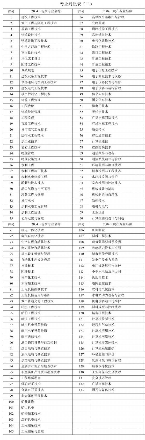 注:本表按教育部現(xiàn)行《普通高等學(xué)校高職高專教育指導(dǎo)性專業(yè)目錄(2005年版)》編制。共涉及“土建施工類、工程管理類、建筑設(shè)計類、城鎮(zhèn)規(guī)劃與管理類、建筑設(shè)備類、市政工程類、房地產(chǎn)類、水利工程與管理類、機械設(shè)計制造類、自動化類、電子信息類、通訊類、環(huán)保類、機電設(shè)備類、公路運輸類、鐵路運輸類、港口運輸類、管道運輸類、林業(yè)技術(shù)類、城市軌道運輸類、水上運輸類、民用運輸類、資源勘查類、水利水電設(shè)備類、地質(zhì)工程與技術(shù)類、礦冶工程類、礦物加工類、測繪類、材料類、能源類、電力技術(shù)、計算機類、安全類、廣播影視類”等34類133個專業(yè),其中本專業(yè)76個,相近專業(yè)57個。