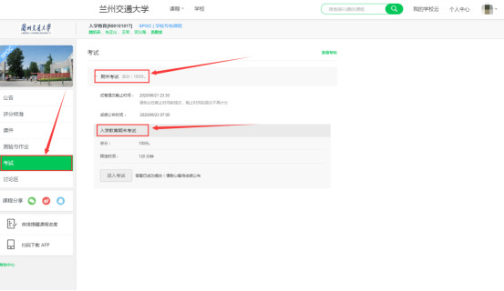 進入課程學(xué)習(xí)頁面后,點擊左側(cè)欄的“考試”,即可參加當(dāng)前開放的考試。一般老師會在公告中,提醒考試卷子發(fā)布的信息。注意:因為考試被系統(tǒng)默認成計分項,進入考試頁面前,請仔細查看考試老師設(shè)置的相關(guān)信息。且一定注意是期末考試,非模擬自測。