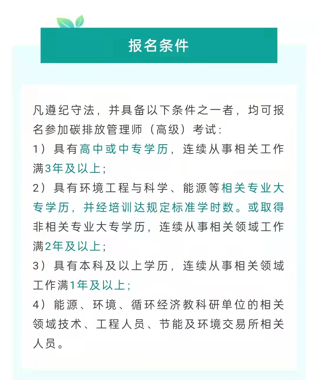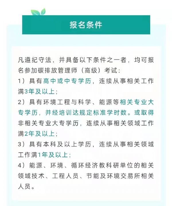 凡遵紀(jì)守法,并具備以下條件之一者,均可報(bào)名參加碳排放管理師(高級(jí))考試:
