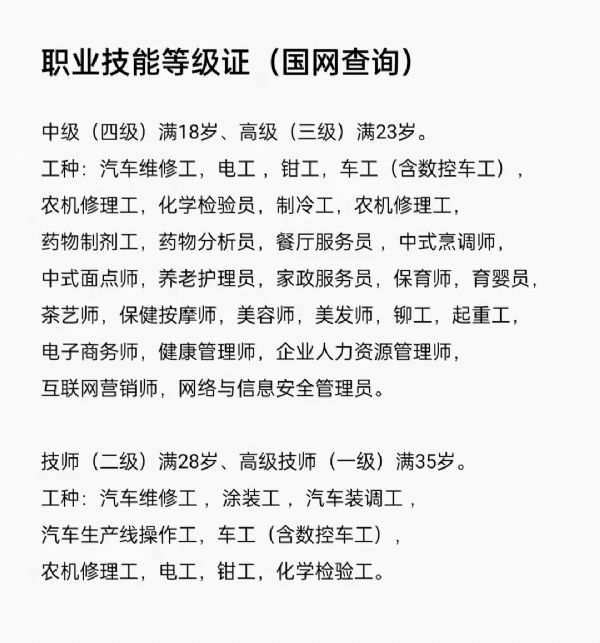 依據(jù)國(guó)家職業(yè)標(biāo)準(zhǔn),社會(huì)培訓(xùn)評(píng)價(jià)職業(yè)技能等級(jí)分五級(jí),分別為初級(jí)工(五級(jí))、中級(jí)工(四級(jí))、高級(jí)工(三級(jí))、技師(二級(jí))、高級(jí)技師(一級(jí))。其中,高級(jí)職稱(chēng)相當(dāng)于高級(jí)技師(一級(jí))職業(yè)技能等級(jí)證,中級(jí)職稱(chēng)相當(dāng)于技師(二級(jí))職業(yè)技能等級(jí)證,初級(jí)職稱(chēng)相當(dāng)于高級(jí)工(三級(jí))職業(yè)技能等級(jí)證