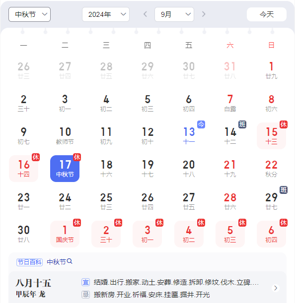 9月15日至9月17日放假調(diào)休,共三天。9月18日(星期三)正常上班。提前預(yù)祝各位同事中秋快樂!闔家團圓!