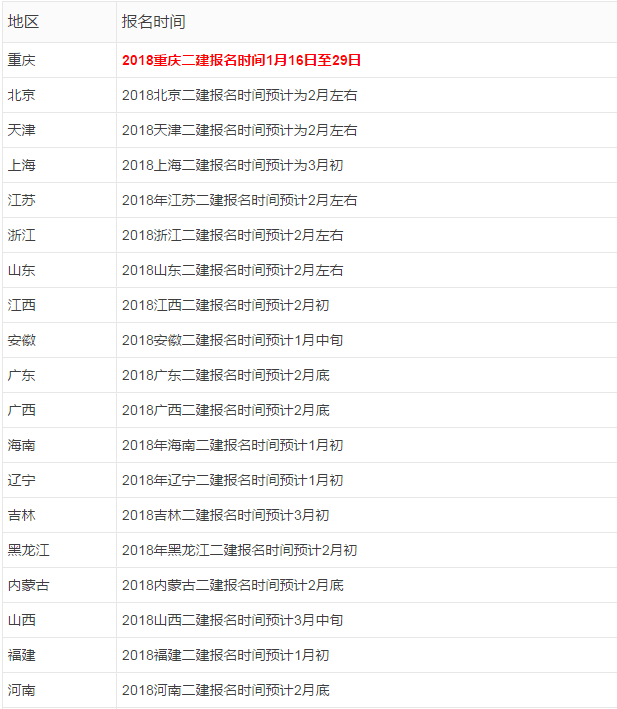 重慶市的報名時間已公布,其它省份的也不遠了,下表為各省份2018二建報名時間預測(紅色表示已更新),小編會在各個省份報名時間出來的時候及時告知大家,請大家繼續(xù)關注!